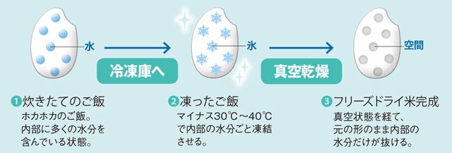 その後、真空状態にして気圧を下げると、凍った水分が液体にならずに直接気体になる「昇華」が起こります。これにより、お米の内部から水分だけが抜け、軽くて空気を含んだ状態になります。